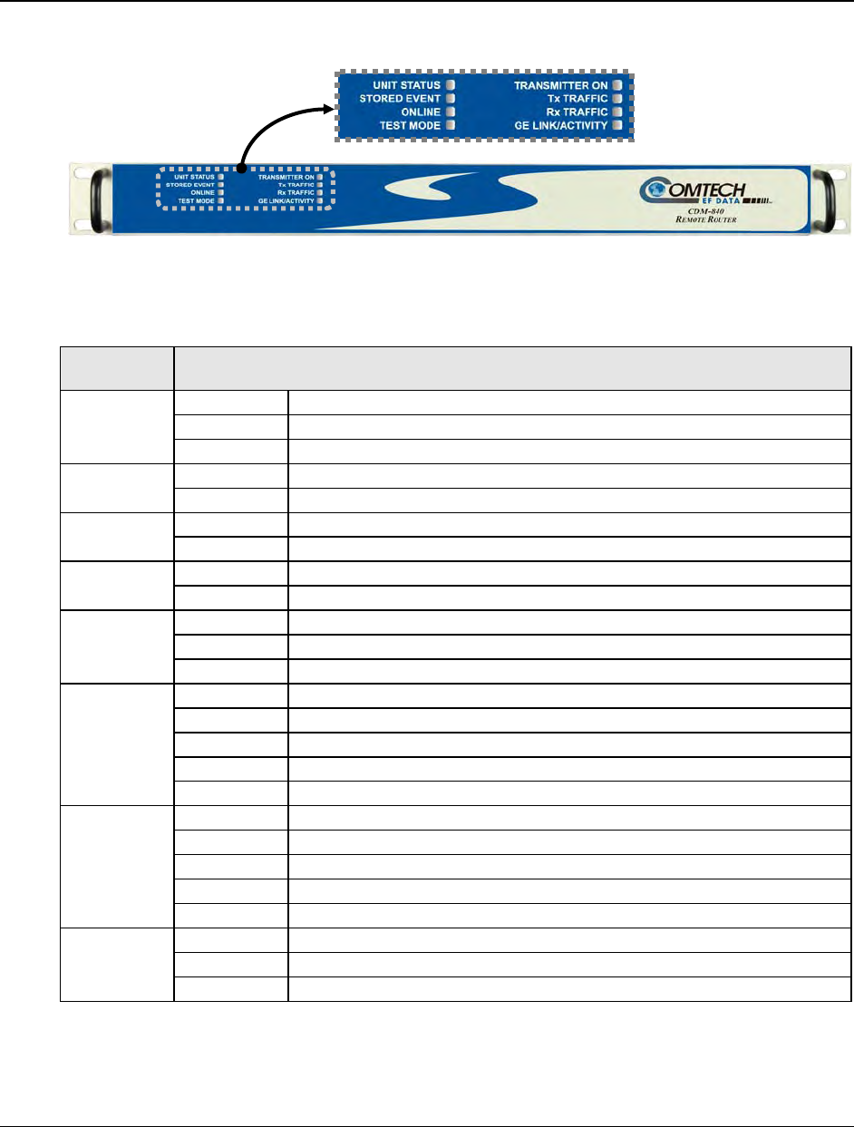 Green (blinking) No Tx Traffic Faults, blinks when a packet is being transmitted to the satellite link from this unit.