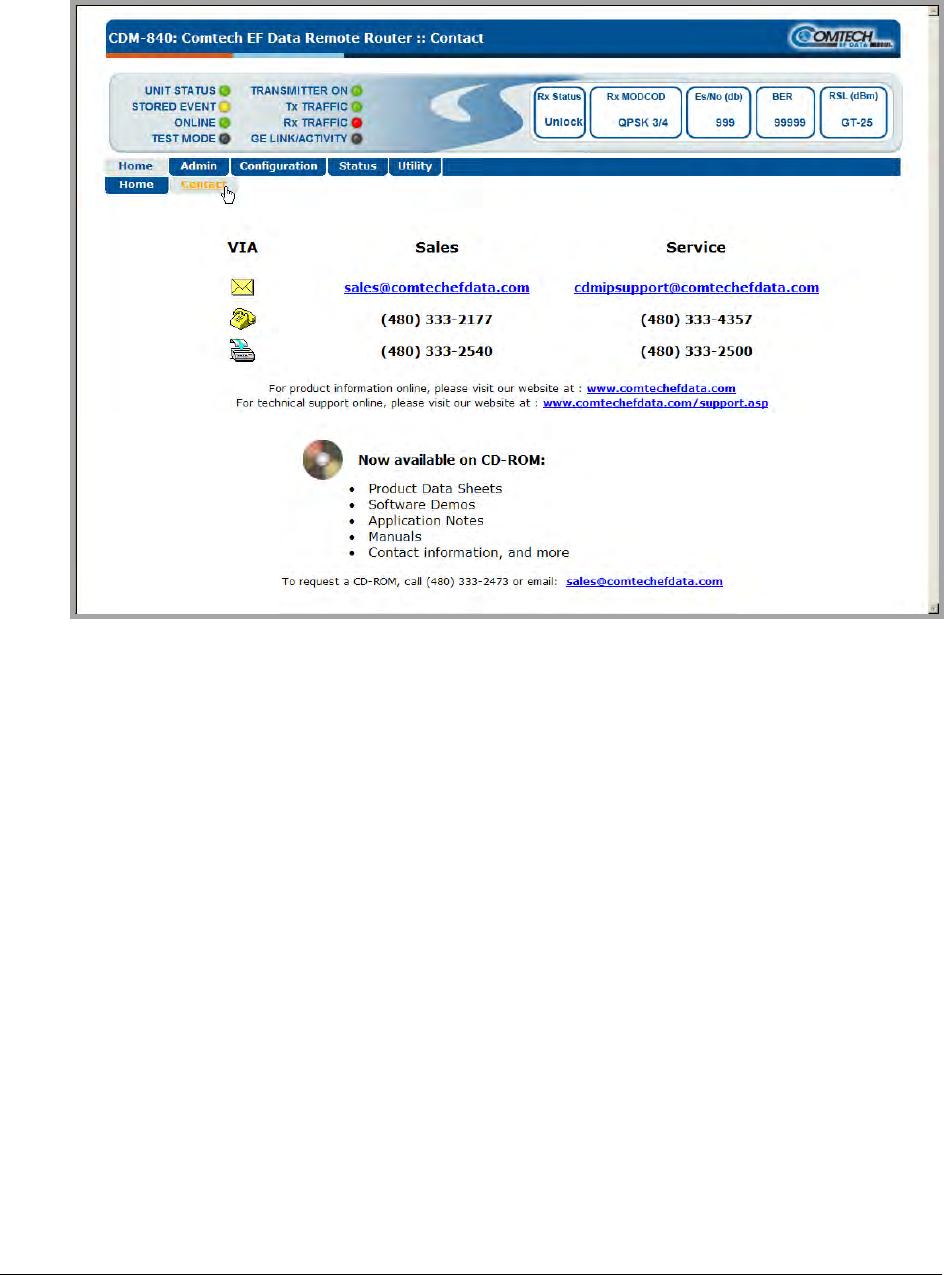 The ‘Home | Contact’ page (Figure 5-2) provides basic contact information to reach Comtech