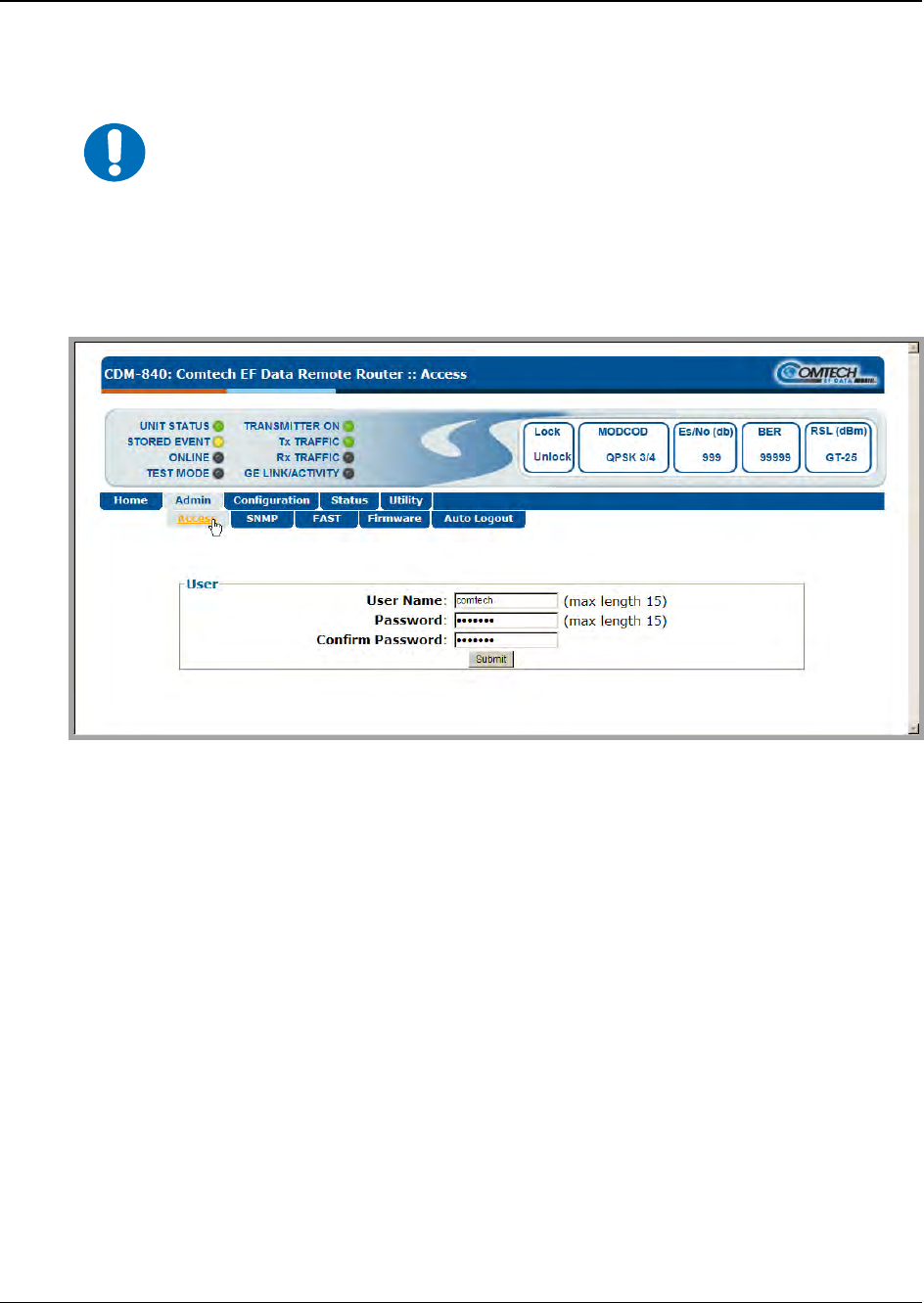 The ‘Admin | Access’ page (Figure 5-3) provides the means to set up the user names and