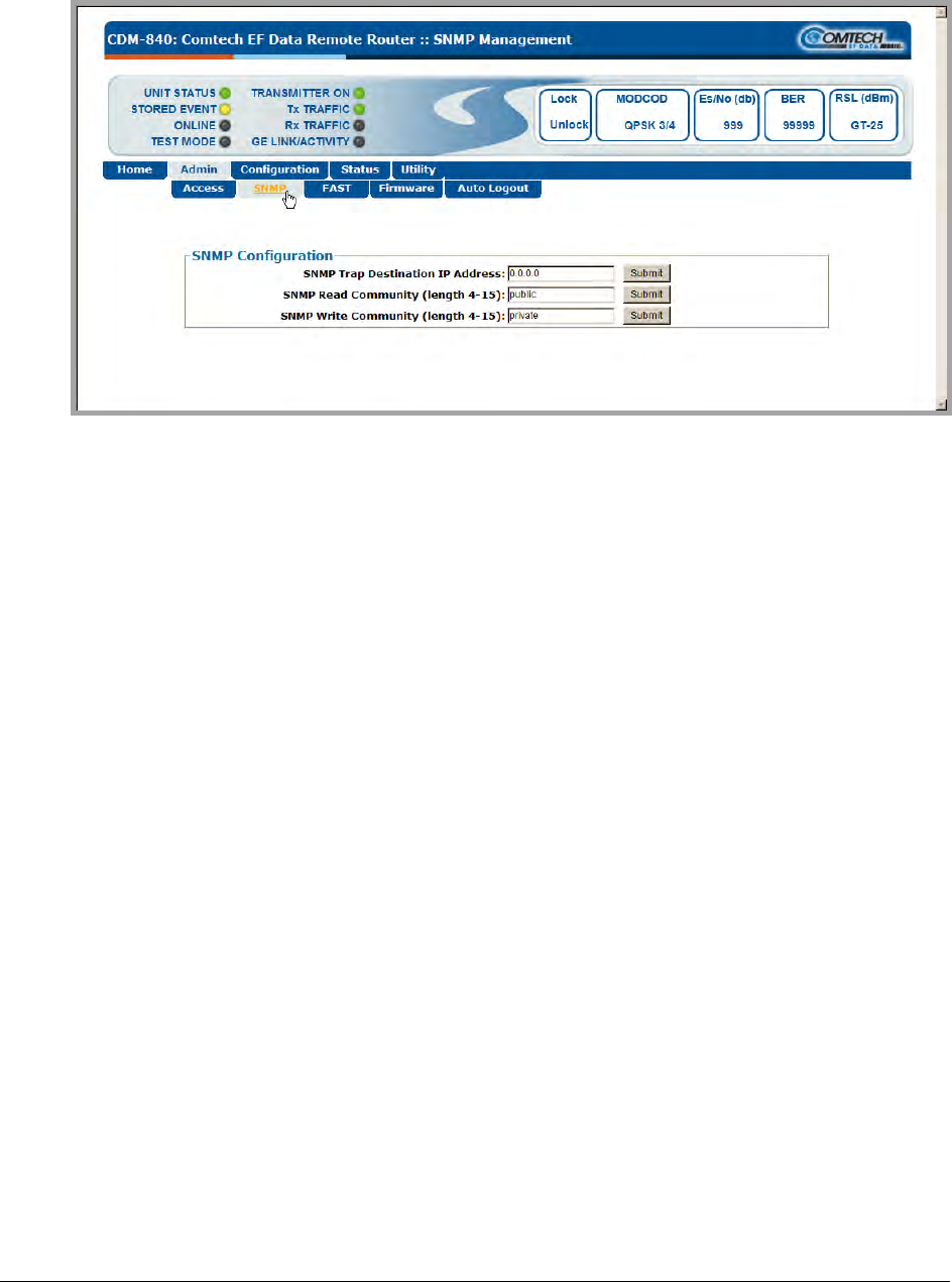 The ‘Admin | SNMP’ page (Figure 5-4) sets and returns administration information for the