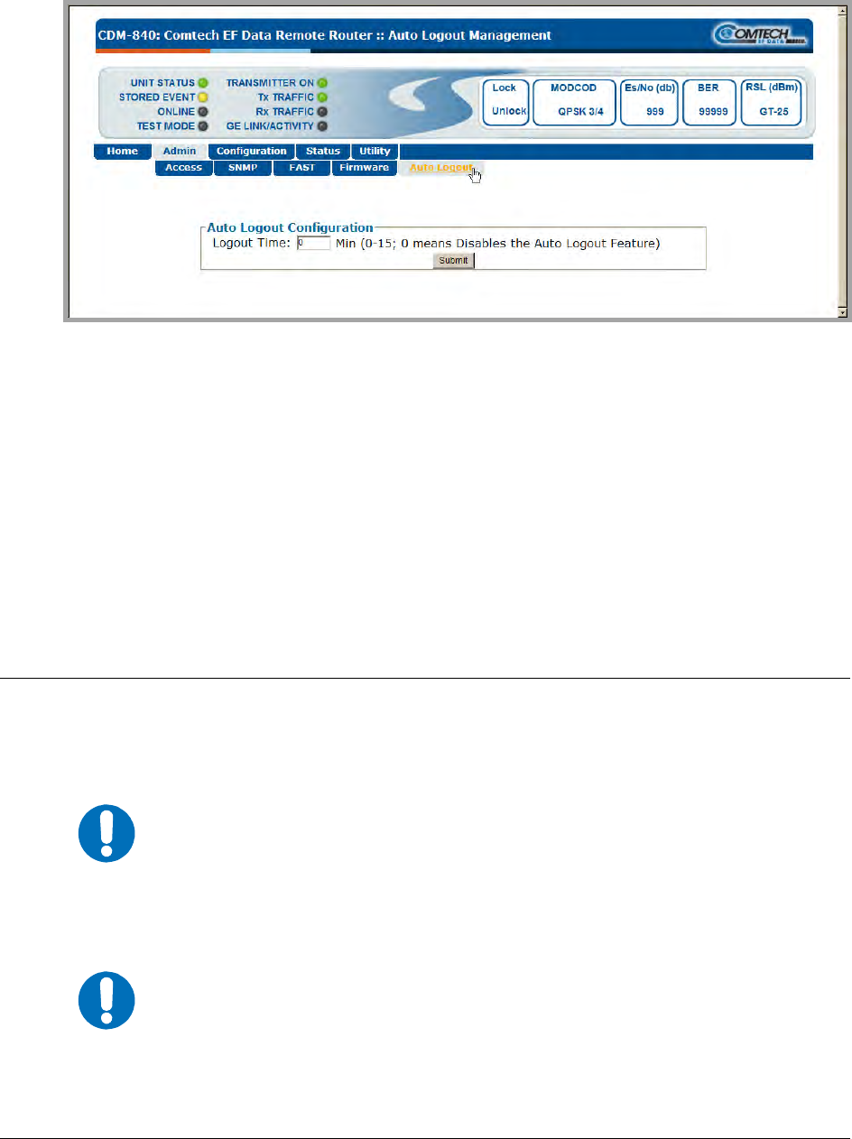 The ‘Admin | Auto Logout’ page (Figure 5-7) provides a security measure for safeguarding