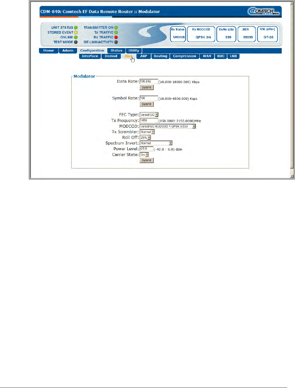 The ‘Configuration | Mod’ page (Figure 5-11) permits the user to configure CDM-840 Tx
