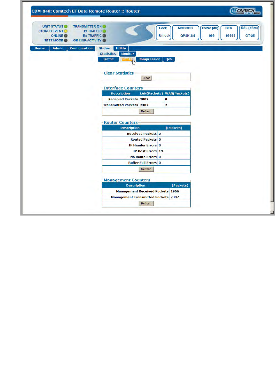 The ‘Status | Statistics | Router’ page (Figure 5-20) is used to view cu