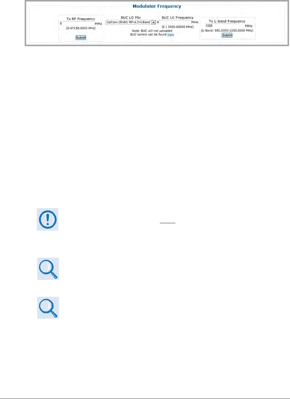 Enter the Tx RF Frequency in MHz. Click [Submit]. Upon submission, if the BUC LO