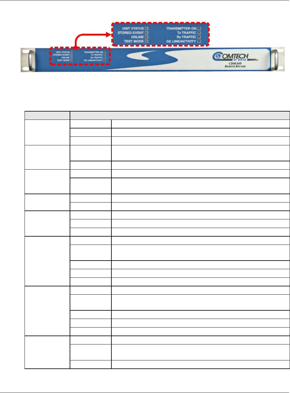 The CDM-840 Remote Router front panel (Figure 1-4) features eight Light-Emitting Diode (LED)