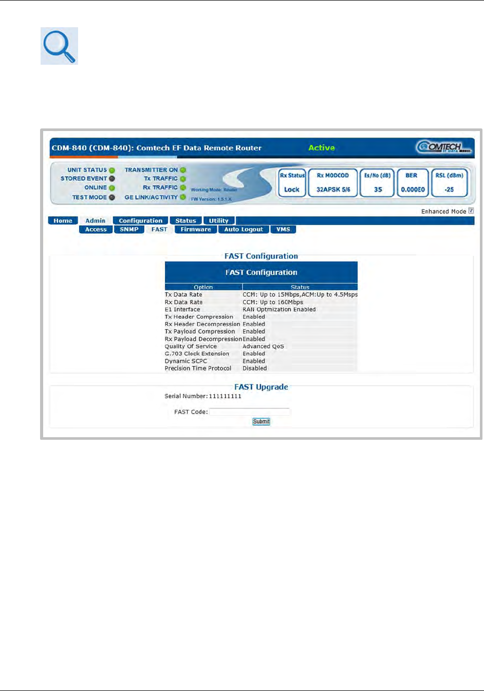 Use the Web Server Interface ‘Admin | FAST’ page to manage CDM-840 FAST Features. This