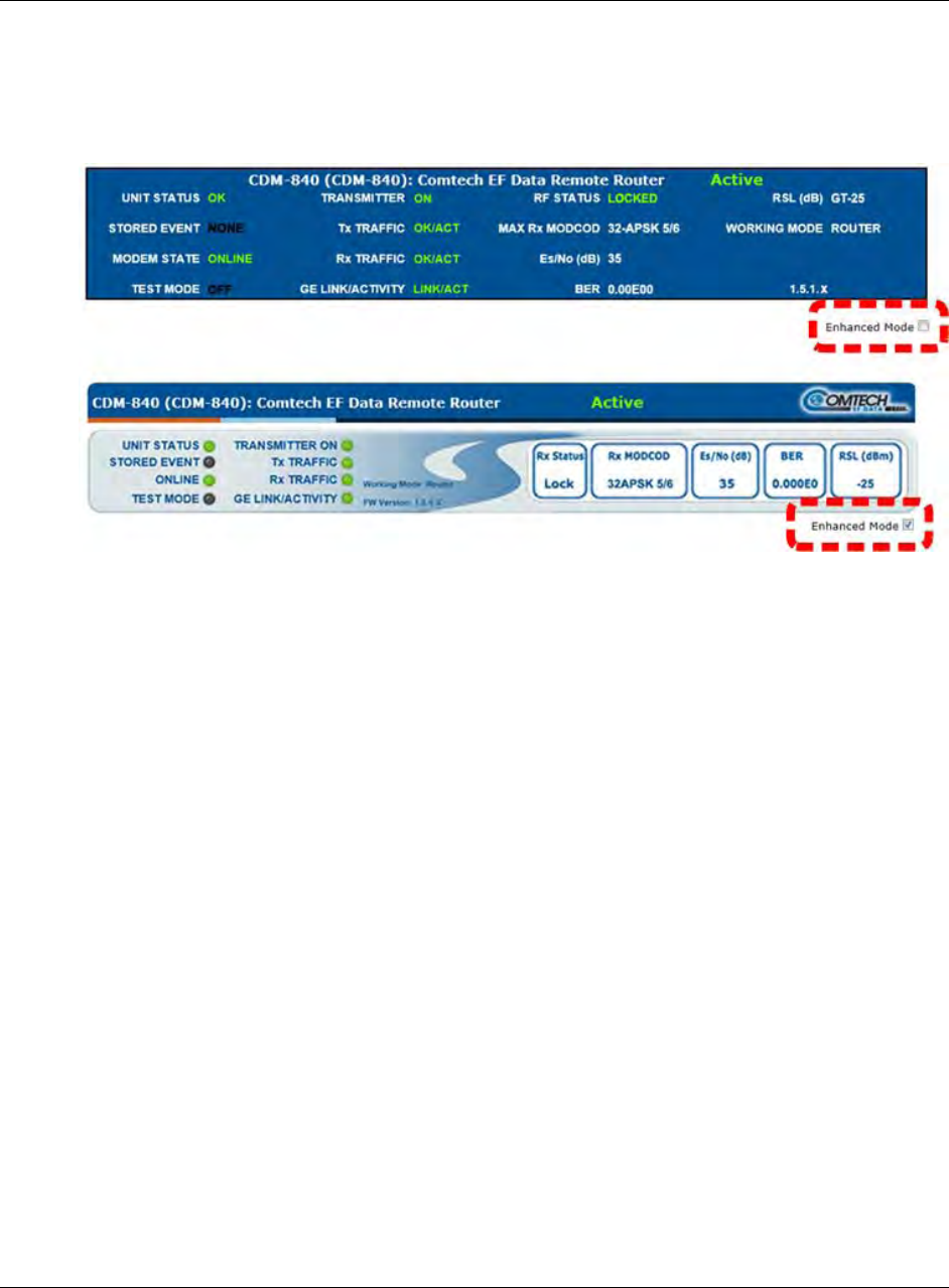 format. The Enhanced Mode features virtual LEDs and navigation tabs for Web page access.