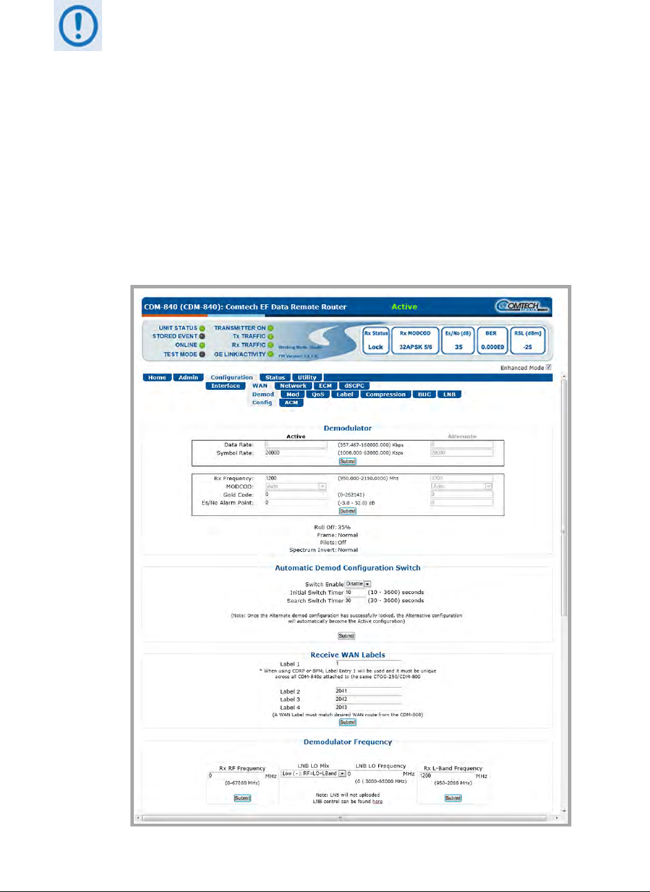 Click the Configuration | WAN | Demod tabs, and then select the Config or ACM tab to